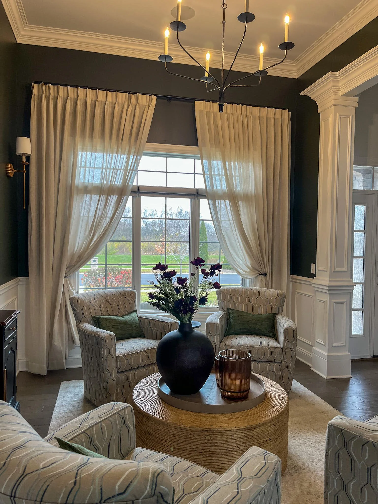 The final design transformed their sitting room and foyer into a warm, sophisticated, and beautifully layered space that felt both inviting and elevated. While she was out for the day, I created her own HGTV-style reveal moment, unveiling the completed rooms in a true “big reveal” experience.